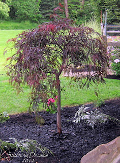 Best Laid Plans...Do you ever have days when all your plans go out the window all because of a single event? Well, we had one of those this past Saturday. It all started with what was supposed to be a quick trip to a plant sale that a local garden club was having. After we purchased some geraniums, snapdragons, and petunias, we made our way to Lowe's to buy some ferns to hang on our front porch. Once there, our plans for the entire day suddenly changed when we both fell in love with this wispy Japanese Maple tree. Once we got the tree home, we realized, that in order to showcase it, we would have to dig up our entire patio garden and move and divide, all of the plants and rocks (except the ferns growing against the fence and the hydrangea which remained in their old locations). Whew! What a job... But, we are so pleased with the result! We still have a few "bare spots" to fill in, but it makes us smile every time we look out at it... Below you can see a collage of all of our hard work after it was freshly mulched and watered.. The Japanese Maple tree is now a lovely focal point in our garden and I can even enjoy it from my kitchen window while washing the dishes.