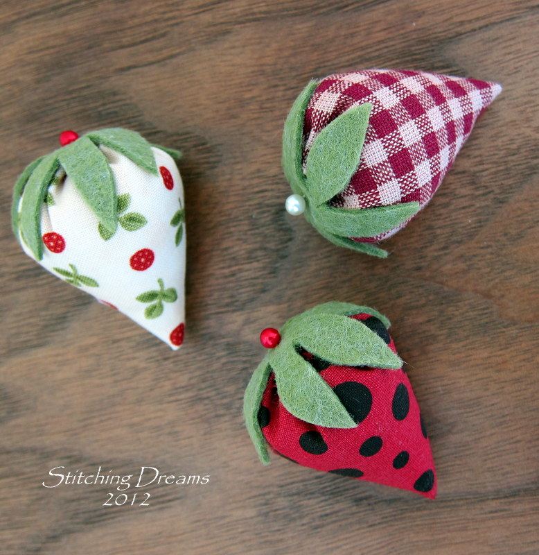 I had been wanting to try making some fabric strawberries for a while, so what better time than now? Oh, I just loved making these little things and would have made dozens if the end of the month wasn't closing in on me. I followed Martha Stewart's template for the berry itself, but rather than using her template for the top of the strawberry, I simply cut one free-hand out of some olive colored felt. They are filled with fiberfill rather than the sand that Martha suggests. (Do you think she disapproves?) After gathering the top, I just glued on the "leaves" and added a pretty pin. Can you see how making these would be addicting?!