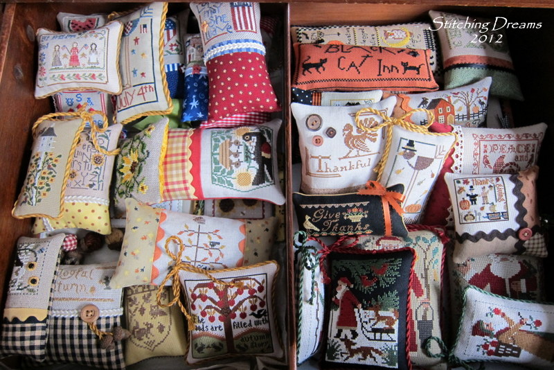 I thought you might enjoy a photo of all of my "bowl" finishes... Yes--here they are...all 68 (if I counted correctly!) of them. Of these, all but 11 were stitched this year, and all were finished this year. I made many more little creations, too, in the form of monthly ornaments and birthday and Christmas gifts for friends, so I think the total for 2012 is somewhere close to 100 smalls. I know 2013 will not be nearly as productive a year in terms of stitching, but I do hope you'll continue to visit my blog...